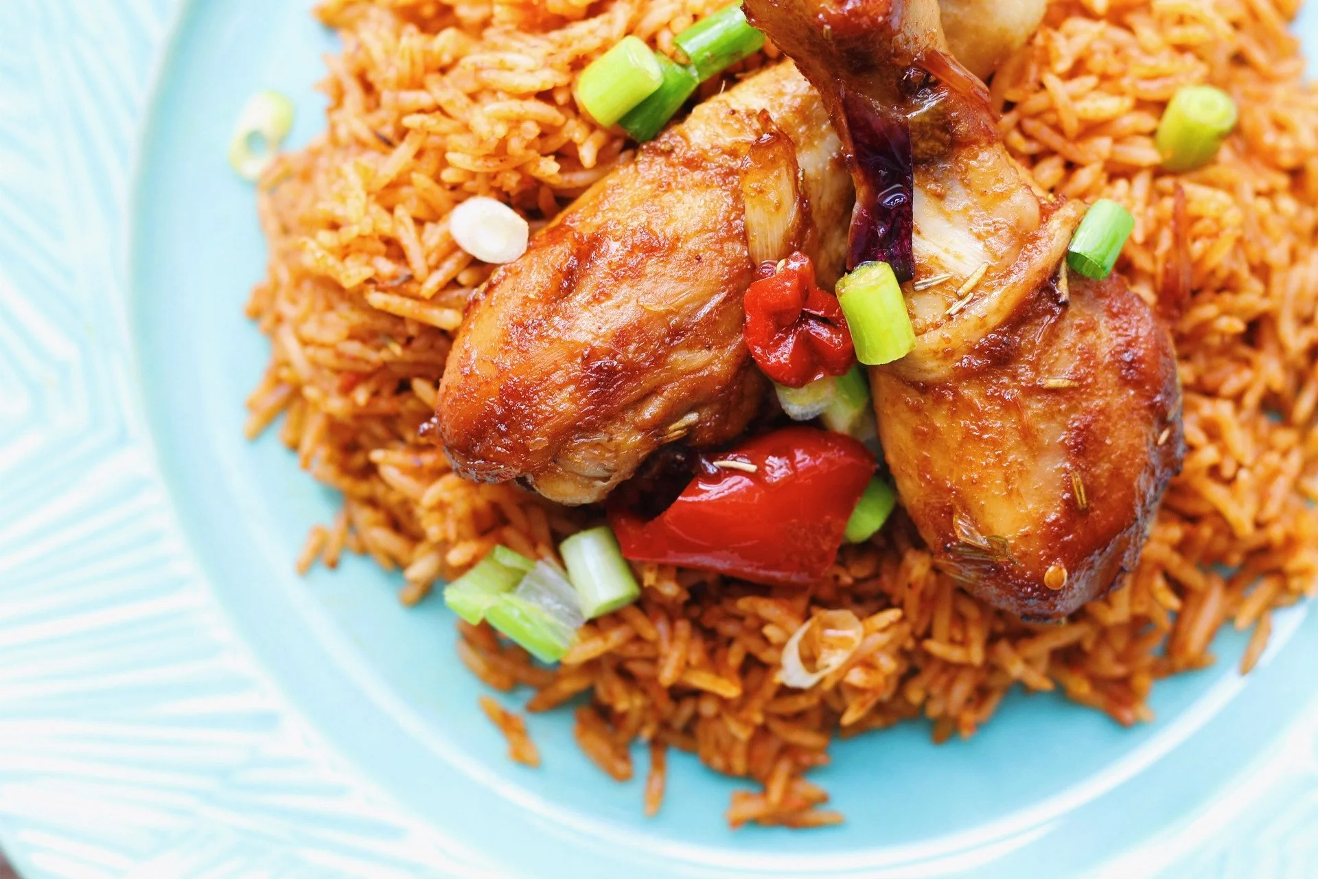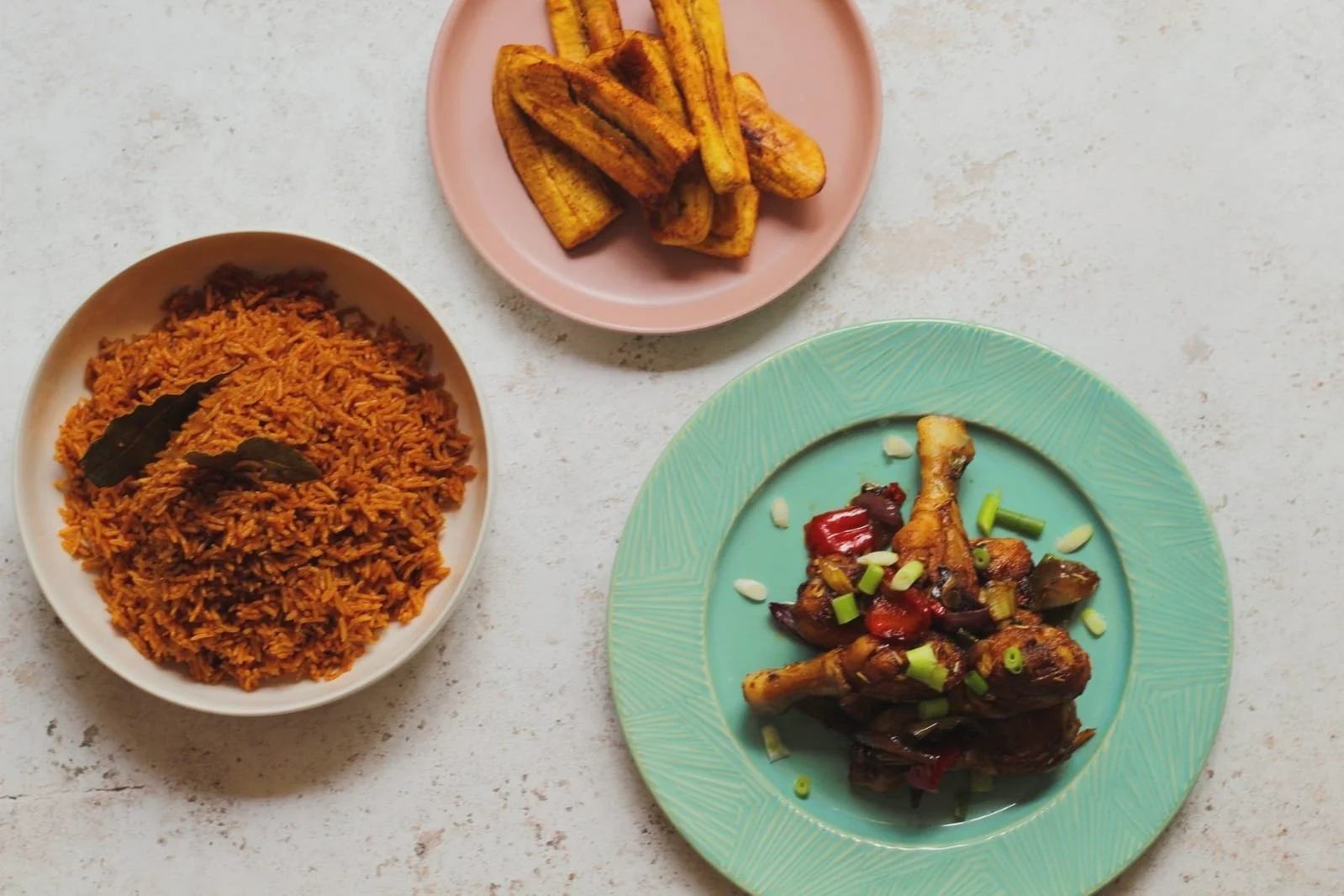 (L-R): Jollof rice, plantain and Spicy garlic chicken in a chilli soy glaze.
